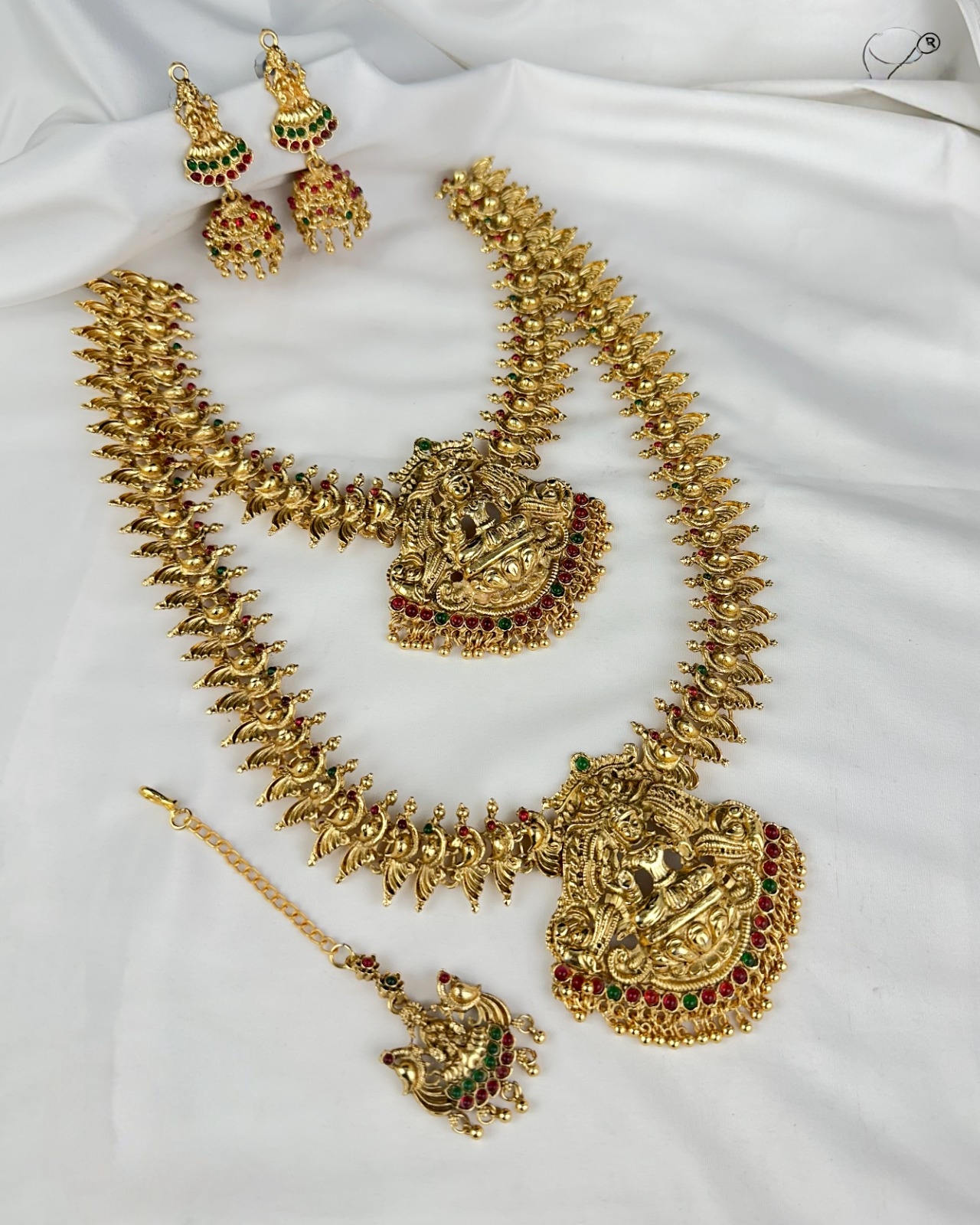 This elegant semi bridal temple jewelry set features two richly crafted haar necklaces adorned with detailed Lakshmi pendants and antique gold finishing. Embellished with ruby and green stones, the set includes matching jhumkas and a beautifully coordinated maang tikka. Perfect for weddings and traditional ceremonies, it adds a grand, divine, and authentic South Indian bridal appearance.