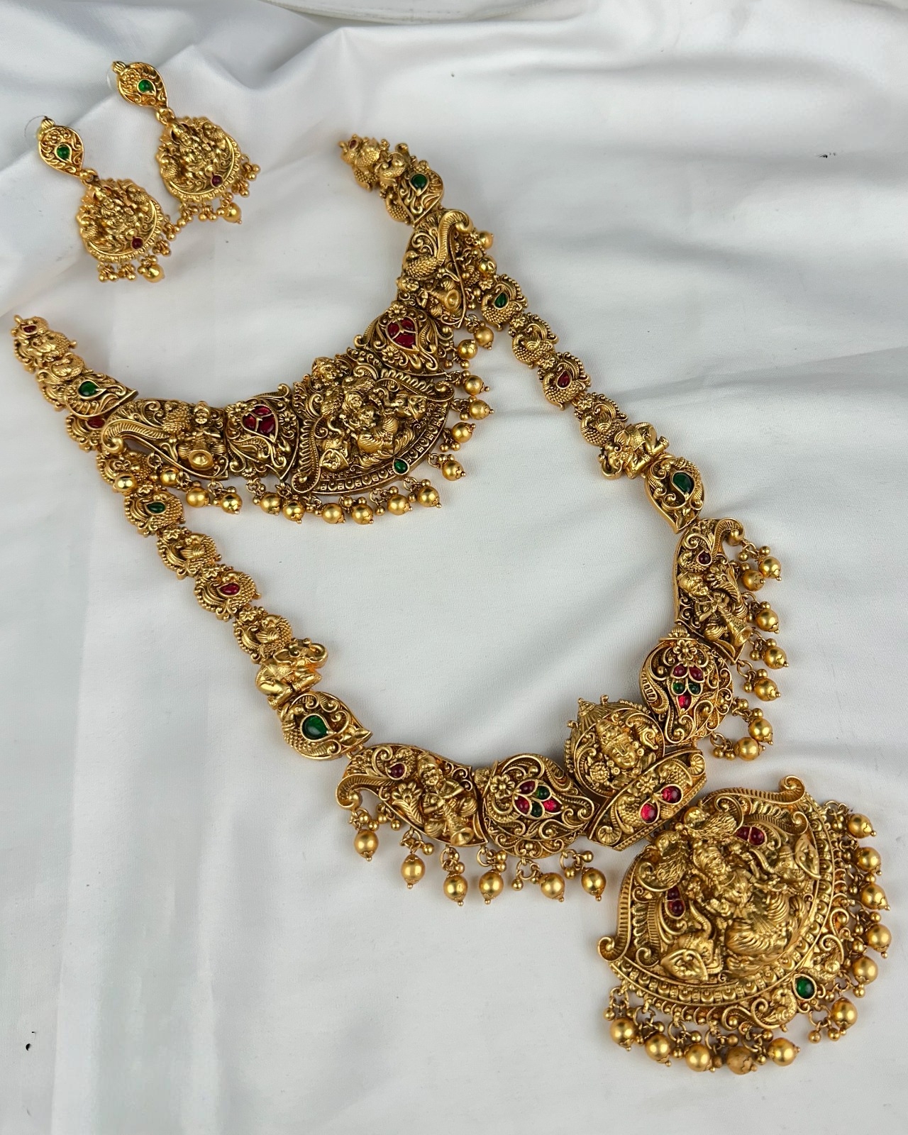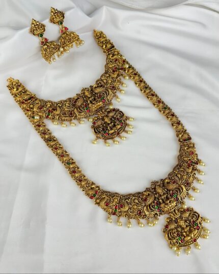 This semi bridal temple jewelry set features a beautifully crafted long haar paired with a matching choker, both designed with detailed Lakshmi motifs and antique gold artistry. Embellished with ruby and green stones along with pearl-like drop beads, it delivers a rich traditional finish. The accompanying earrings complete the perfect bridal look for weddings and festive occasions.