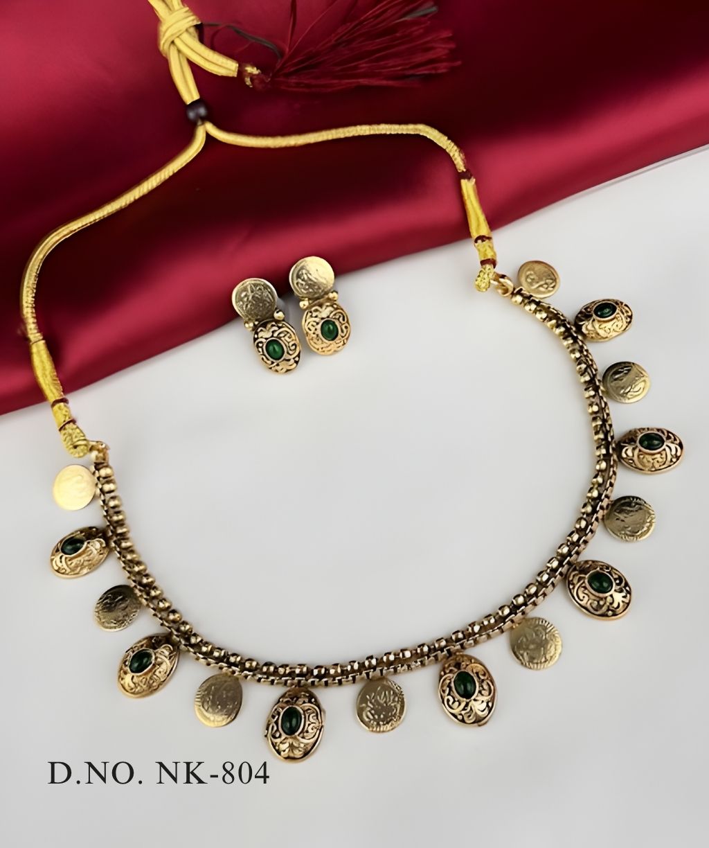 This ethnic choker set features an oxidized gold-tone finish, giving it a beautiful antique appeal. The main chain is adorned with alternating coin charms and detailed oval pendants, each set with a deep green stone. The matching stud earrings mirror the coin and stone-set design. It closes with an adjustable thread dori, making it a perfect statement piece for traditional or festive occasions.