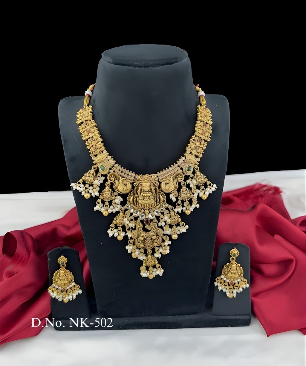 This exquisite temple bridal Choker Set showcases Goddess Lakshmi detailing crafted in an antique gold finish. Embellished with kundan stones, intricate motifs, and cascading pearl droplets, it radiates royal elegance. The matching earrings complete the luxurious look, making it a perfect choice for weddings, festivals, and grand traditional occasions, enhancing every bridal ensemble with divine charm and opulence.
